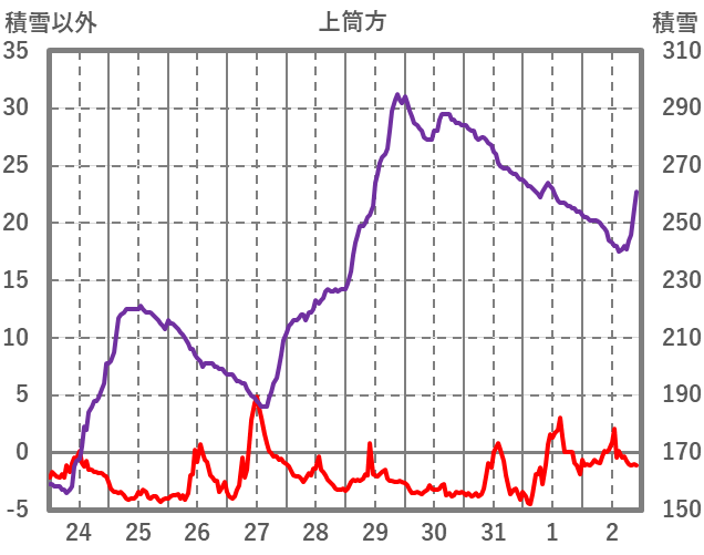 | 日 | 時 | 気温 | 降水 | 風向/風速 | 日照 | 積雪 | 降雪 |
