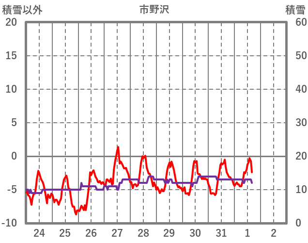 | 日 | 時 | 気温 | 降水 | 風向/風速 | 日照 | 積雪 | 降雪 |