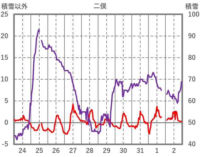 | 日 | 時 | 気温 | 降水 | 風向/風速 | 日照 | 積雪 | 降雪 |