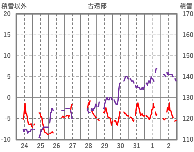 | 日 | 時 | 気温 | 降水 | 風向/風速 | 日照 | 積雪 | 降雪 |