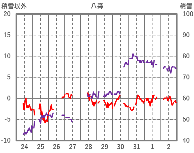 | 日 | 時 | 気温 | 降水 | 風向/風速 | 日照 | 積雪 | 降雪 |
