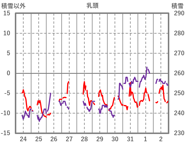 | 日 | 時 | 気温 | 降水 | 風向/風速 | 日照 | 積雪 | 降雪 |