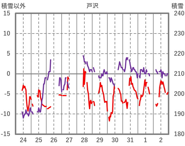 | 日 | 時 | 気温 | 降水 | 風向/風速 | 日照 | 積雪 | 降雪 |