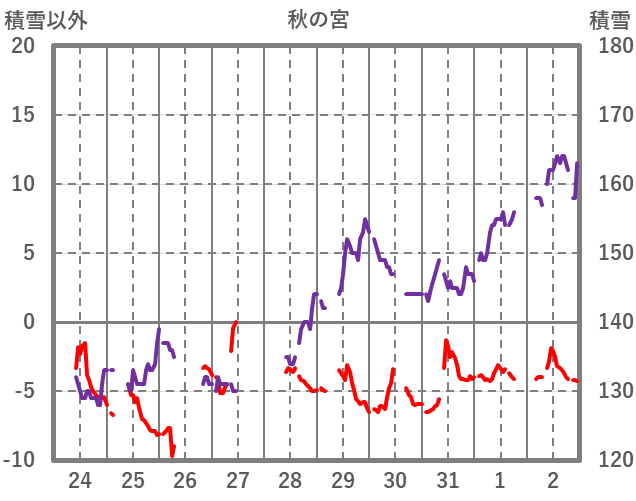 | 日 | 時 | 気温 | 降水 | 風向/風速 | 日照 | 積雪 | 降雪 |