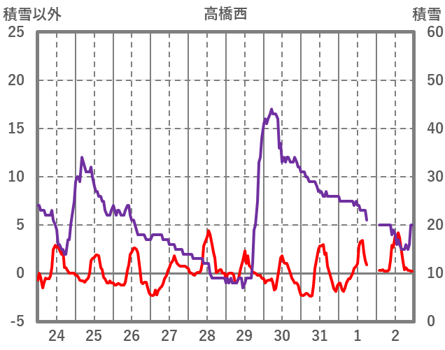 | 日 | 時 | 気温 | 降水 | 風向/風速 | 日照 | 積雪 | 降雪 |