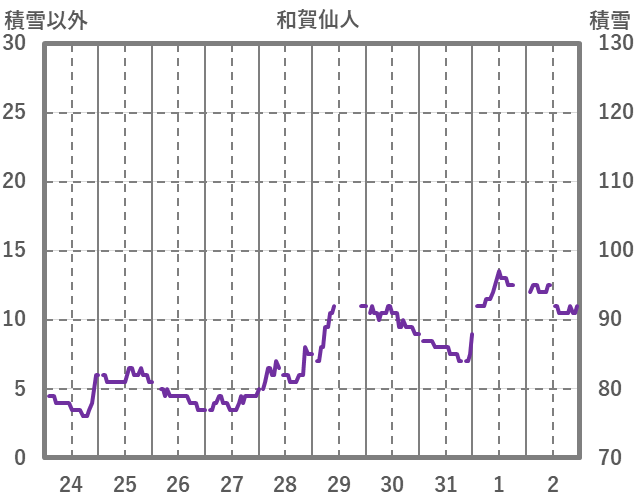 | 日 | 時 | 気温 | 降水 | 風向/風速 | 日照 | 積雪 | 降雪 |