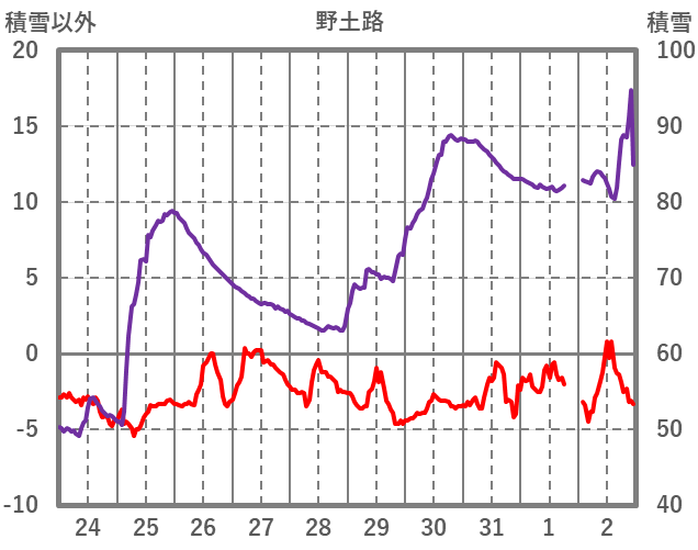 | 日 | 時 | 気温 | 降水 | 風向/風速 | 日照 | 積雪 | 降雪 |