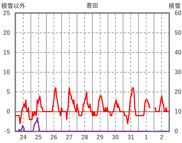 | 日 | 時 | 気温 | 降水 | 風向/風速 | 日照 | 積雪 | 降雪 |