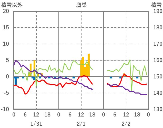 | 日 | 時 | 気温 | 降水 | 風向/風速 | 日照 | 積雪 | 降雪 |