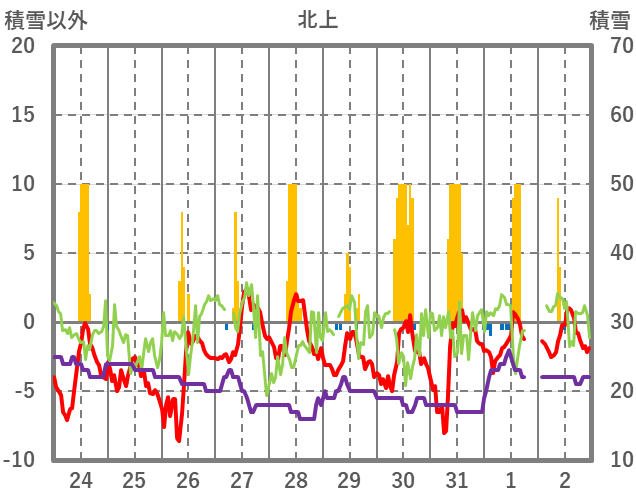 | 日 | 時 | 気温 | 降水 | 風向/風速 | 日照 | 積雪 | 降雪 |