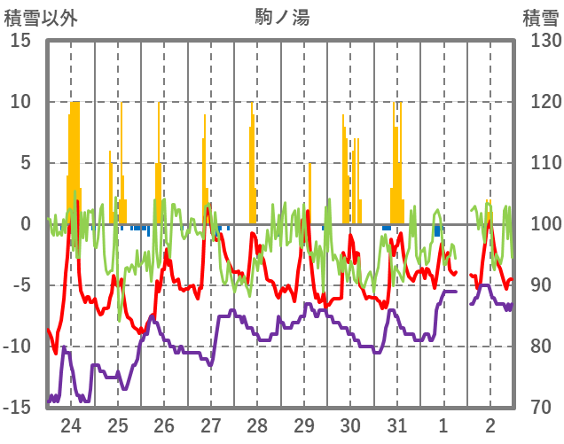 | 日 | 時 | 気温 | 降水 | 風向/風速 | 日照 | 積雪 | 降雪 |