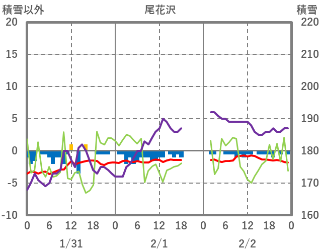 | 日 | 時 | 気温 | 降水 | 風向/風速 | 日照 | 積雪 | 降雪 |