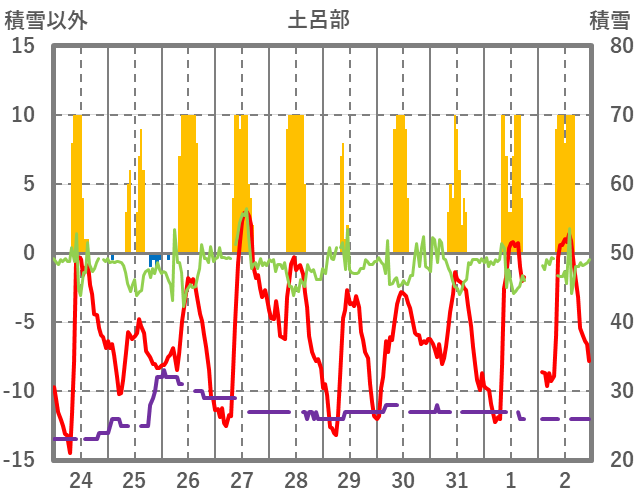 | 日 | 時 | 気温 | 降水 | 風向/風速 | 日照 | 積雪 | 降雪 |