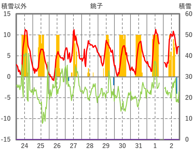 | 日 | 時 | 気温 | 降水 | 風向/風速 | 日照 | 積雪 | 降雪 |