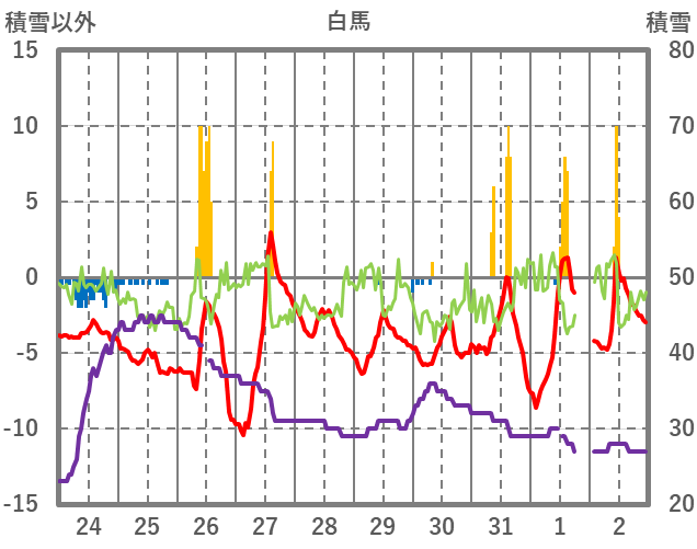 | 日 | 時 | 気温 | 降水 | 風向/風速 | 日照 | 積雪 | 降雪 |