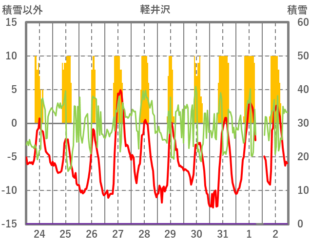 | 日 | 時 | 気温 | 降水 | 風向/風速 | 日照 | 積雪 | 降雪 |