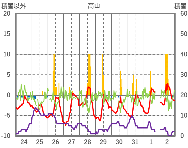 | 日 | 時 | 気温 | 降水 | 風向/風速 | 日照 | 積雪 | 降雪 |
