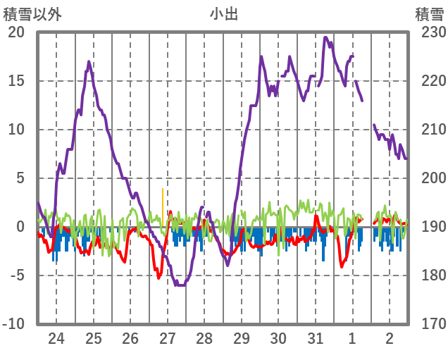 | 日 | 時 | 気温 | 降水 | 風向/風速 | 日照 | 積雪 | 降雪 |