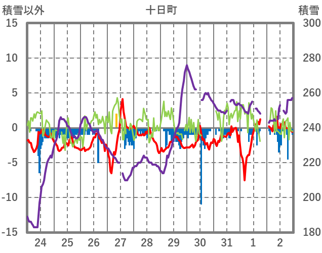 | 日 | 時 | 気温 | 降水 | 風向/風速 | 日照 | 積雪 | 降雪 |