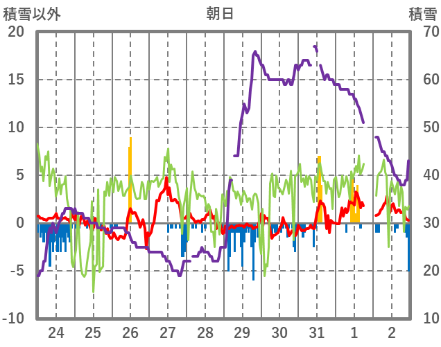 | 日 | 時 | 気温 | 降水 | 風向/風速 | 日照 | 積雪 | 降雪 |