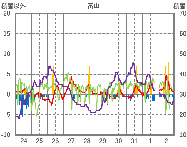 | 日 | 時 | 気温 | 降水 | 風向/風速 | 日照 | 積雪 | 降雪 |
