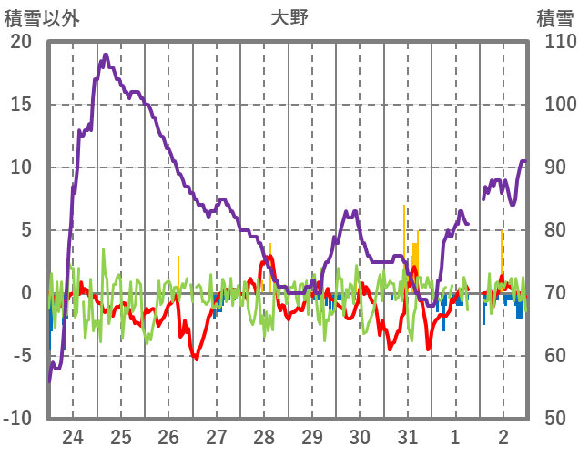 | 日 | 時 | 気温 | 降水 | 風向/風速 | 日照 | 積雪 | 降雪 |