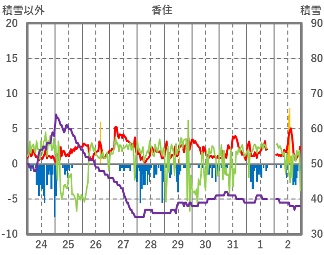 | 日 | 時 | 気温 | 降水 | 風向/風速 | 日照 | 積雪 | 降雪 |