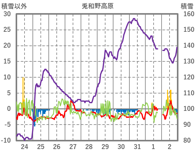 | 日 | 時 | 気温 | 降水 | 風向/風速 | 日照 | 積雪 | 降雪 |