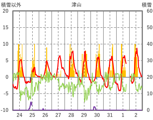 | 日 | 時 | 気温 | 降水 | 風向/風速 | 日照 | 積雪 | 降雪 |