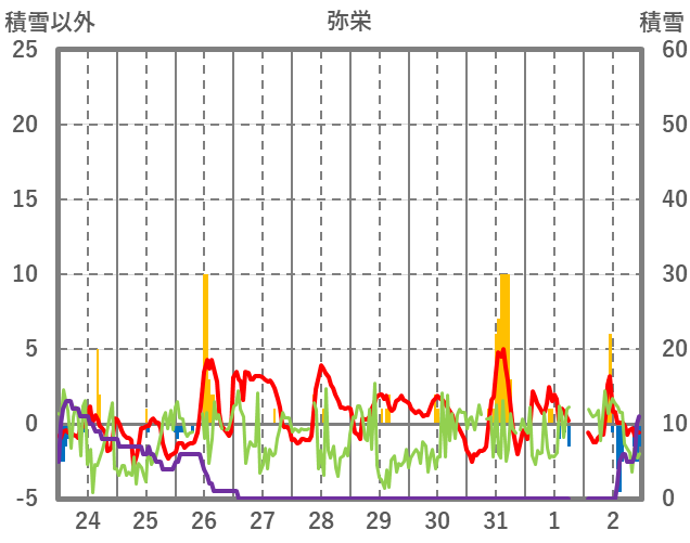 | 日 | 時 | 気温 | 降水 | 風向/風速 | 日照 | 積雪 | 降雪 |