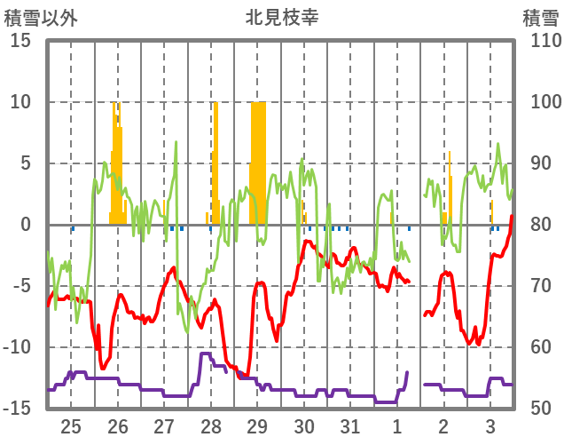 | 日 | 時 | 気温 | 降水 | 風向/風速 | 日照 | 積雪 | 降雪 |