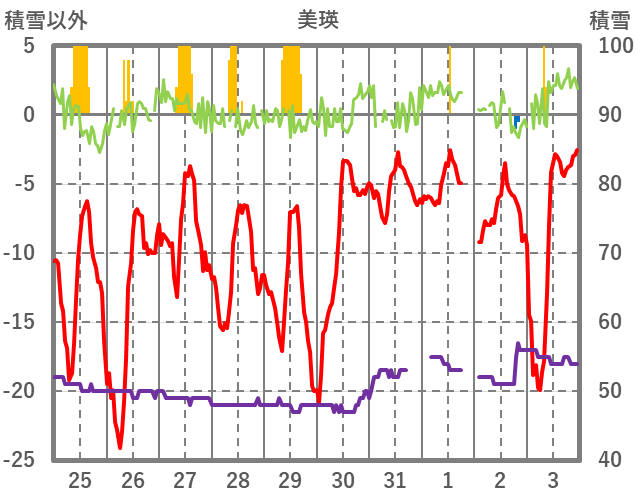 | 日 | 時 | 気温 | 降水 | 風向/風速 | 日照 | 積雪 | 降雪 |
