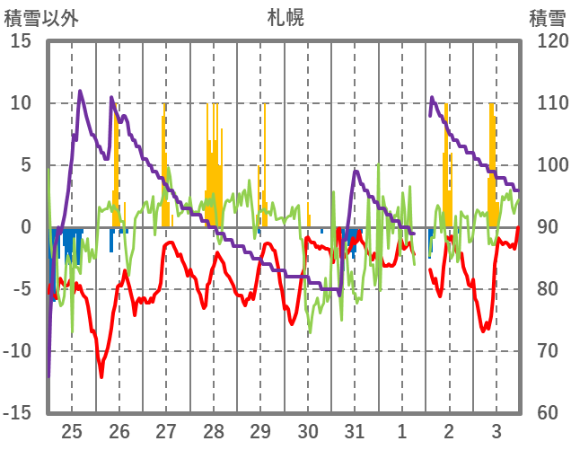 | 日 | 時 | 気温 | 降水 | 風向/風速 | 日照 | 積雪 | 降雪 |