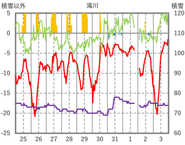 | 日 | 時 | 気温 | 降水 | 風向/風速 | 日照 | 積雪 | 降雪 |