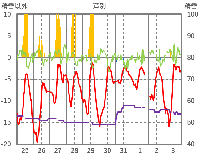 | 日 | 時 | 気温 | 降水 | 風向/風速 | 日照 | 積雪 | 降雪 |