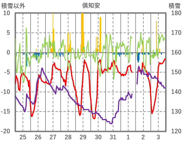 | 日 | 時 | 気温 | 降水 | 風向/風速 | 日照 | 積雪 | 降雪 |