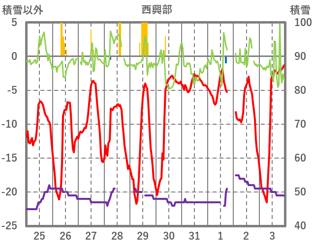 | 日 | 時 | 気温 | 降水 | 風向/風速 | 日照 | 積雪 | 降雪 |