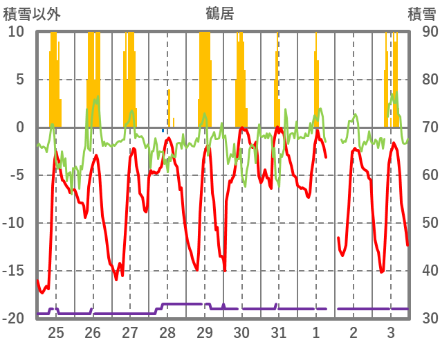 | 日 | 時 | 気温 | 降水 | 風向/風速 | 日照 | 積雪 | 降雪 |
