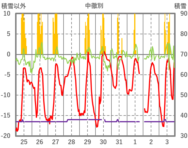 | 日 | 時 | 気温 | 降水 | 風向/風速 | 日照 | 積雪 | 降雪 |