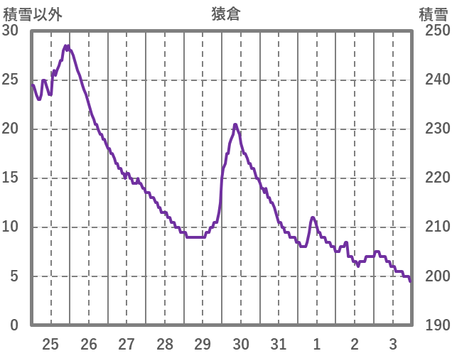 | 日 | 時 | 気温 | 降水 | 風向/風速 | 日照 | 積雪 | 降雪 |