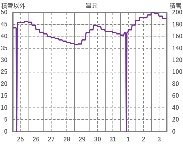 | 日 | 時 | 気温 | 降水 | 風向/風速 | 日照 | 積雪 | 降雪 |
