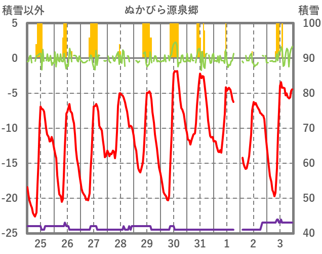 | 日 | 時 | 気温 | 降水 | 風向/風速 | 日照 | 積雪 | 降雪 |