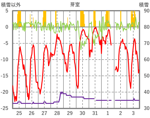 | 日 | 時 | 気温 | 降水 | 風向/風速 | 日照 | 積雪 | 降雪 |