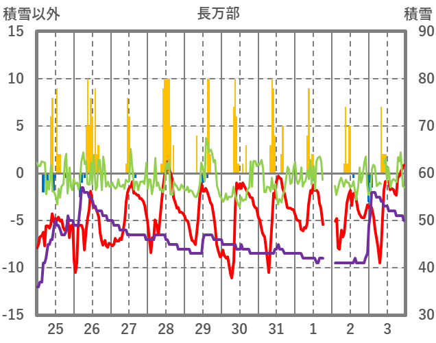 | 日 | 時 | 気温 | 降水 | 風向/風速 | 日照 | 積雪 | 降雪 |