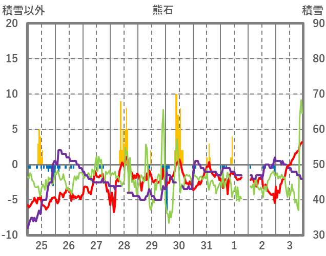 | 日 | 時 | 気温 | 降水 | 風向/風速 | 日照 | 積雪 | 降雪 |
