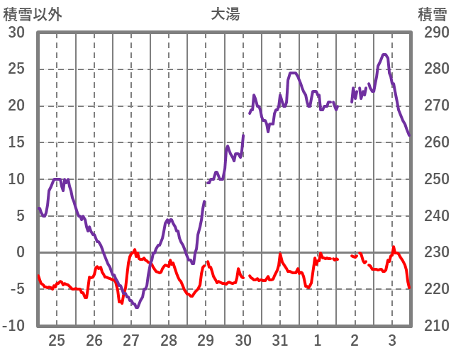 | 日 | 時 | 気温 | 降水 | 風向/風速 | 日照 | 積雪 | 降雪 |