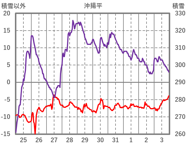 | 日 | 時 | 気温 | 降水 | 風向/風速 | 日照 | 積雪 | 降雪 |