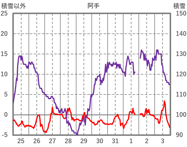 | 日 | 時 | 気温 | 降水 | 風向/風速 | 日照 | 積雪 | 降雪 |