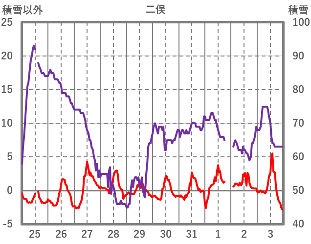 | 日 | 時 | 気温 | 降水 | 風向/風速 | 日照 | 積雪 | 降雪 |