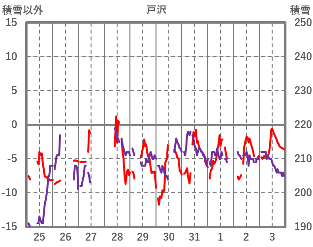 | 日 | 時 | 気温 | 降水 | 風向/風速 | 日照 | 積雪 | 降雪 |